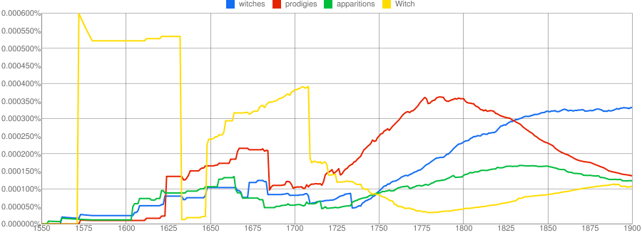 Here I was trying to get a glimpse into the shift in discourses about the supernatural in printed English over the course of the long eighteenth century. Capitalized ‘Witch’ declines very sharply around 1710 — a counterpoint with the more vague ‘prodigies’ and ‘apparitions,’ which rise steadily throughout the period. Seems to accord nicely with the view that the supernatural became less easily explainable in this period.