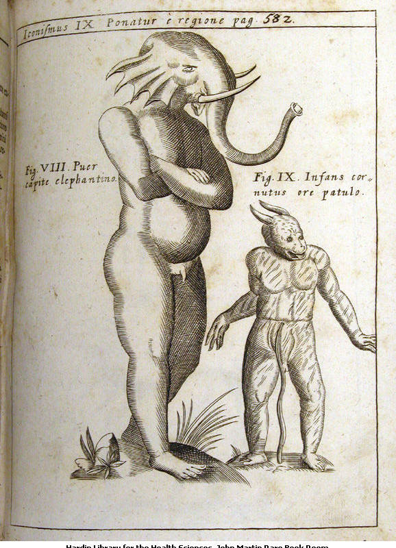 | “Boy with the head of an elephant.” His companion is “a horned infant with spread eyes.” I have no idea what to make of this one. |