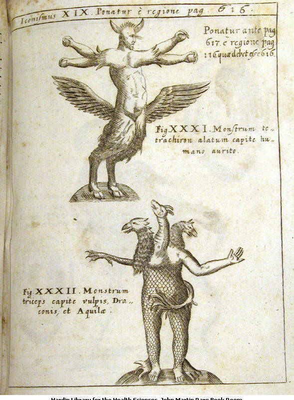 | Schott, 616. Here we find a “winged bird-centaur with the head of a human” and “a three-headed monster with the heads of a fox, a dragon and an eagle.” |