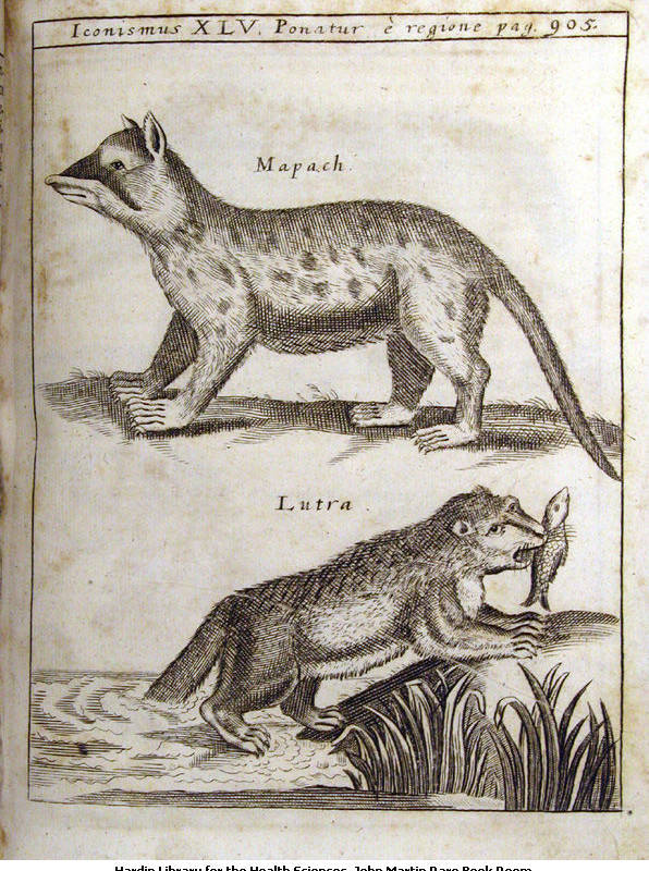 | And here are the more familiar raccoon and river otter. Note, however, that the raccoon (here identified by its Spanish name, “mapache,”) is from the New World and thus would have been as unfamiliar to European audiences of the time as many fantastical beasts. |