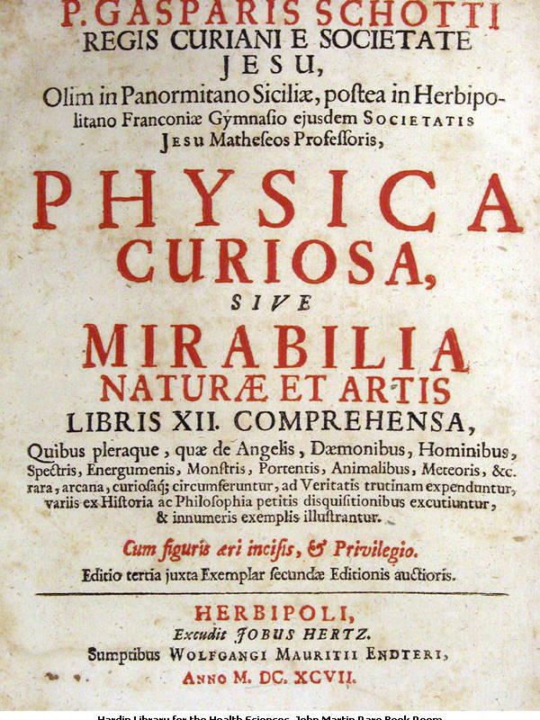 The German-born Schott (1608-1666) was a Jesuit with a keen interest in a number of disciplines, from hydraulic mechanics to medicine and optics. One can surmise that Schott acquired his wide-ranging interests from his mentor, the celebrated Jesuit genius Anathasius Kircher (a polymathic marvel, Kirchner was a founder of Egyptology, used an early microscope to study microbes, lowered himself into an active volcano to learn about the earth’s crust, constructed automatons, invented a magnetic clock and authored an immense encyclopedia on China). Below are a selection of images from Schott’s Physica Curiosa, all of which I selected from the digital collections of the John Martin Rare Books Room at the University of Iowa. I’ve cropped some of the engraved plates to show interesting details and added my attempt at translations of the Latin captions and occasional explanatory notes. As the work’s extended title dryly notes, Schott seeks to document “Angels, Demons, Men, Spirits, the Devil-Possessed, Monsters, Portents, Animals, Meteors, and other rare, arcane and curious things… and to illustrate them by many examples.”