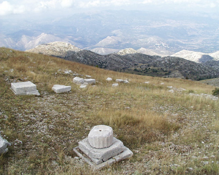 | A view from the ash-altar on Mount Lykaion, showing temple ruins. |