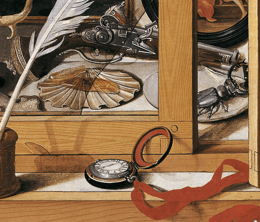 Even as Remps points out the artificial nature of the painting by revealing the site of its creation, however, he also creates the illusion that an actual curiosity cabinet (rather than its mere representation on canvas) stands before us. This photo-realistic effect is achieved by clever touches such as the broken glass on the right hand cabinet window.