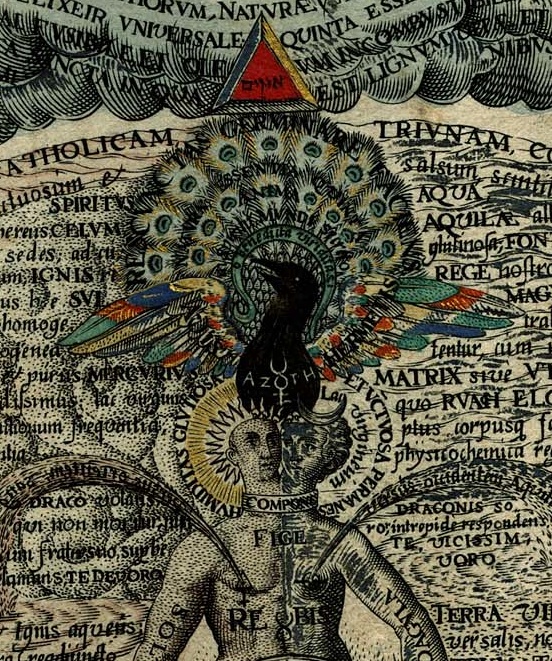 Here we get a sense of the bafflingly complex nature of these images. The figure of the hermaphrodite as a metaphor for the dualistic nature of the universe and the human body is a common one in alchemical imagery. Likewise, the sun and moon are frequently used to symbolize the male and female natures inherent in different elements (the sun is gold/male, the moon female/silver, etc.) The black peacock labelled “AZOTH” leads us deeper into Hermetic territory. Azoth was the hypothesized universal solvent, the “ultimate substance” which could transform all elements. Here it seems to be used to convey the union of male and female (and of all elements) which would allow the corporeal human form to transcend to a divine plane (note the symbol of the trinity above the peacock feathers, which resemble diagrams of the celestial spheres). To top it all off, the “O” in “Azoth” made out of John Dee’s “hieroglyphic monad”!